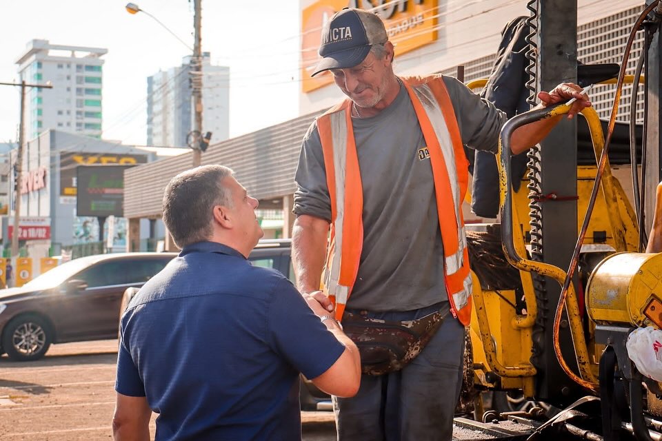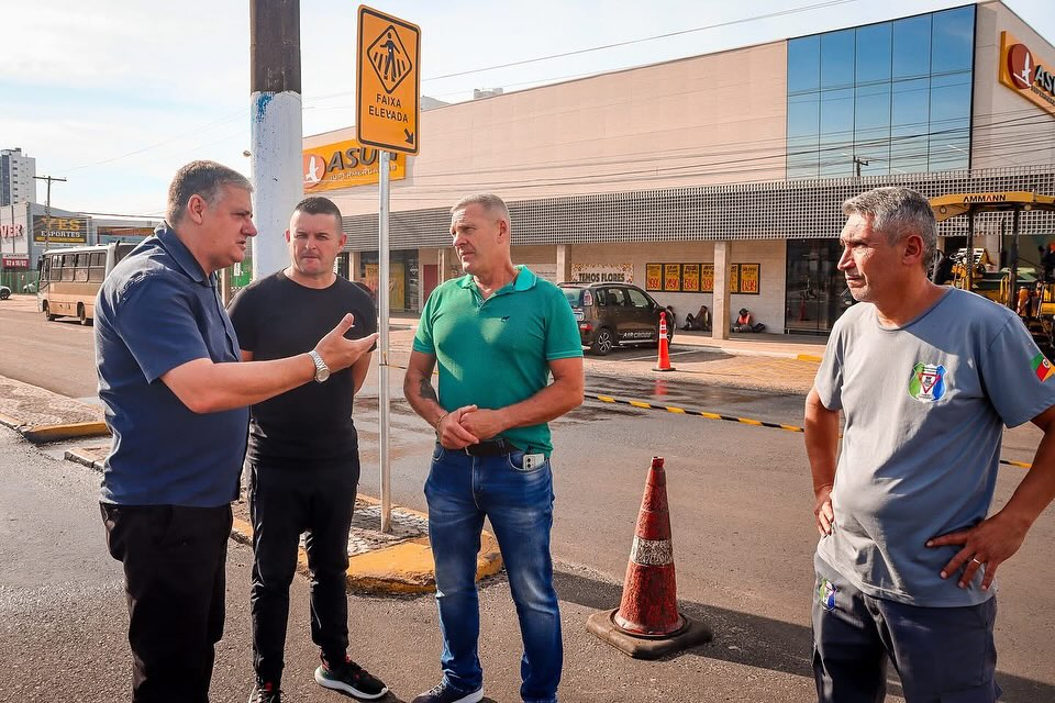 O Prefeito em exercício, Claudiomir, esteve acompanhando de perto a execução da nova faixa elevada na Avenida Fernandes Bastos, em frente ao Asun Supermercados.